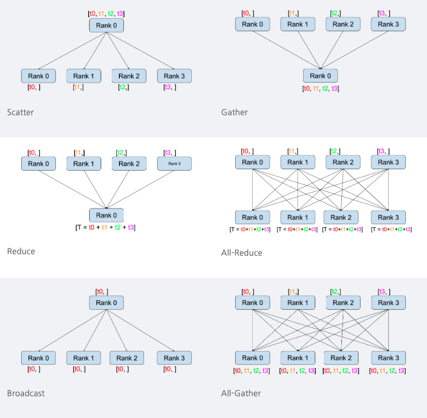 https://tutorials.pytorch.kr/intermediate/dist_tuto.html 먼저 1:N 통신에서는 Scatter, Gather, Reduce, Broadcast 가 존재합니다. Scatter는 각 Rank의 결과값을 다른 모든 Rank에게 분할해서 전달하는 것이고, Gather는 반대로 분할되어 있는 결과들을 하나로 모으는 것입니다. Reduce는 Gather에서 한단계 더 나아가서 값을 모두 모으고 합산하는 방식이며, 마지막으로 Boradcast는 모든 Rank에게 동일한 결과를 전달하는 방식입니다.