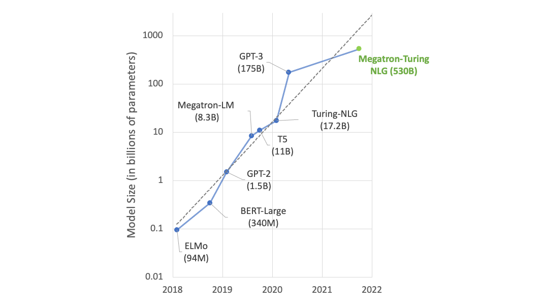 https://developer.nvidia.com/blog/using-deepspeed-and-megatron-to-train-megatron-turing-nlg-530b-the-worlds-largest-and-most-powerful-generative-language-model/?ncid=so-link-563714&fbclid=IwAR04abX43QGzmZJBtef62NGq3MdDkgBVDeDG8iNm3cTU4OSRPdJFdCVrRo0#cid=dl20_so-link_en-us 해당 그래프는 2018년부터 2022년 최근까지 좋은 성능을 보인 Language 모델의 크기(모델이 가진 파라미터 수로 판단합니다)를 보여줍니다. 해가 지날수록 모델이 점차 커져서 2022년 NVIDIA에서 새롭게 선보인 Megatron-Turing NLG의 모델 크기는 530B에 도달하죠. 이는 Language 영역에서만 일어나는 일이 아닙니다.