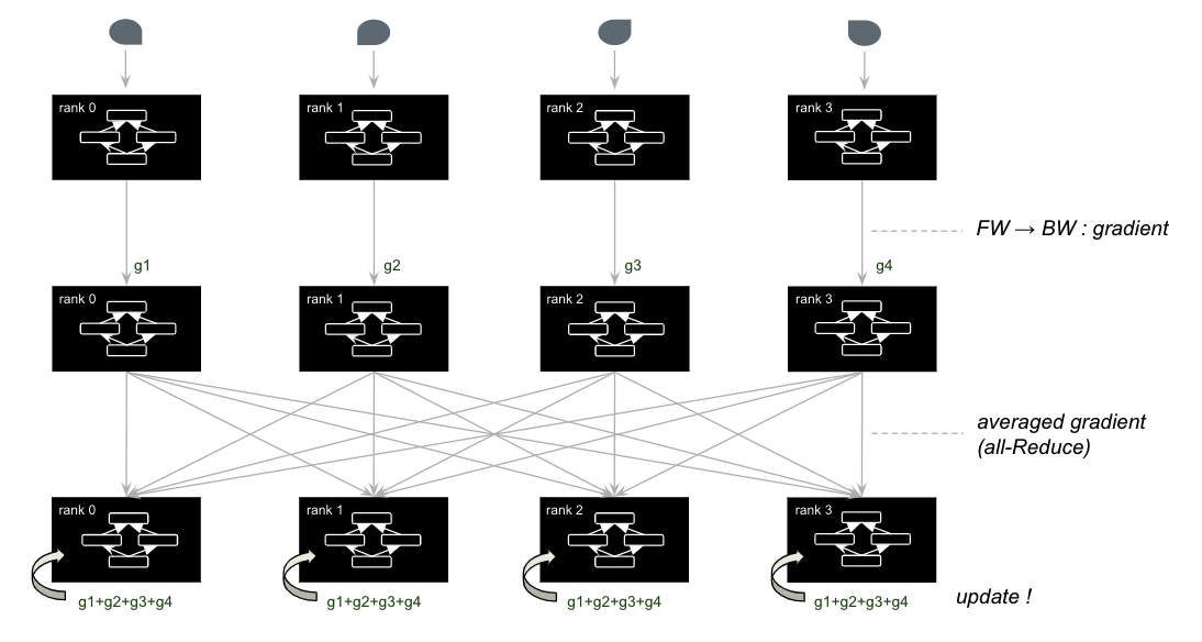 분산학습에서 GPU를 점유하는 프로세스들 즉, 각 Rank의 Gradient 값은 모두 합산해서 평균을 낸 후 다시 모든 Rank에게 전달될 필요가 있습니다. 그래서 분산학습에서 모델 업데이트를 위해 Gradient를 공유하는 방식은 All-Reduce 가 필수적이라고 말할 수 있겠습니다.