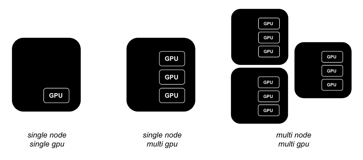 이런 트렌드를 놓치지 않고 점점 커지는 파라미터 수와 데이터셋을 감당하기 위해서 연구자들은 보다 많은 GPU 자원을 필요로 하게 되었습니다. 더이상 GPU 1장(single node, single gpu), 더 나아가 최대 8장의 GPU(single node, multi gpu)가 붙은 서버 한 대로는 큰 모델과 데이터를 학습하기가 어려웠습니다. 이를 해결하기 위해 GPU가 붙은 서버 여러 대를 동시에 사용하여 학습하는 분산학습(multi-node training)이 등장하게 되었습니다.