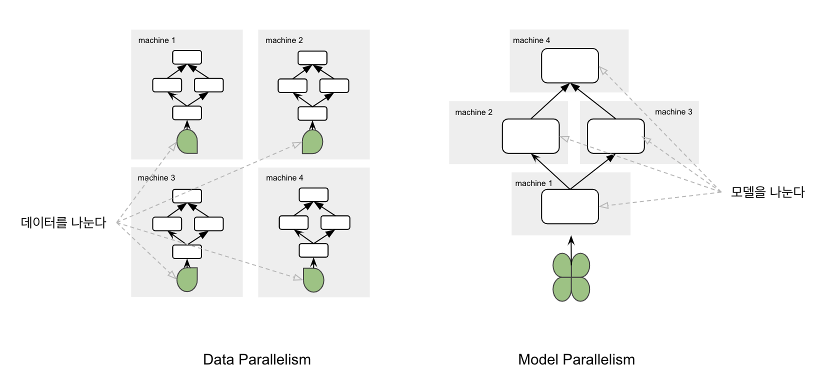 반면 Model Parallelism 은 모델을 쪼개서 학습하기 때문에 큰 모델도 학습이 가능합니다. 그러나 모델을 나눈다는 것은 데이터를 나누는 것보다 큰 비용이 들고, 모델을 잘 이해하고 있는 사람이여야 가능한 작업입니다.