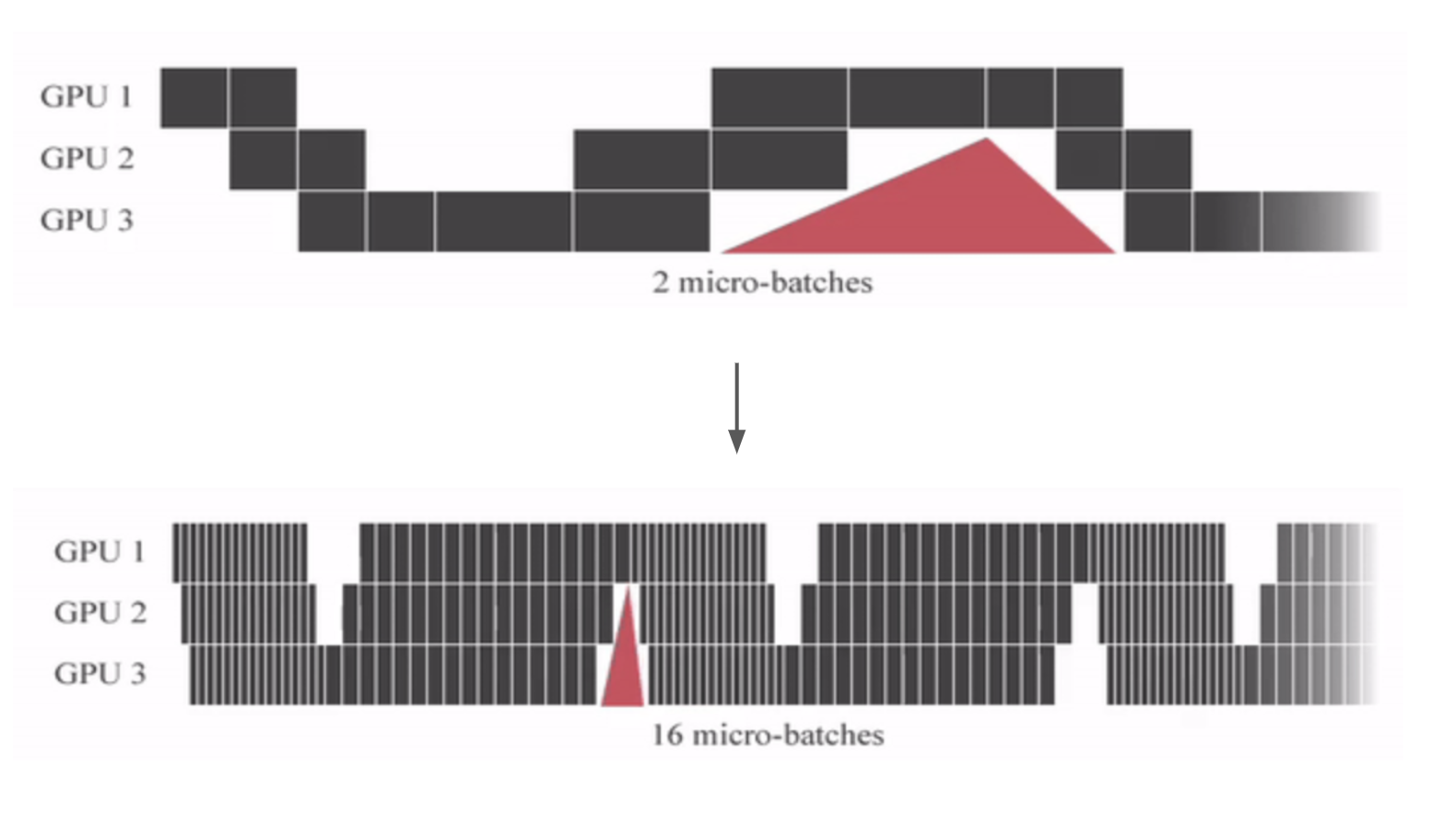 학습 데이터를 mirco-batch로 한번 더 자르게 되면서 GPU가 결과를 기다리며 쉬는 시간이 적어지게 됩니다.
