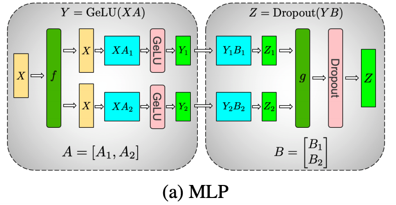 MLP layer는 'Linear1 → GeLU → Linear2 → Dropout' 순으로 연산이 이뤄집니다. `Linear1 → GeLU` 연산에서는 tensor를 column 기준으로 분할하여 연산하였고, `GeLU → Linear2` 연산에서는 tensor를 row 기준으로 분할하여 연산하고 있습니다.