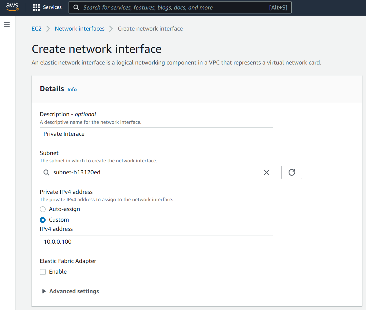Network Interface(NI)는 실제로 물리적 실체를 가질 수도 있고, 소프트웨어만으로도 구현될 수 있습니다. 일반적으로는 이 연결지점을 담당하는 물리장비인 Network Interface Card(NIC)로 NI를 표현하지만, loopback Interface와 같이 소프트웨어 전용 구성 요소로도 나타낼 수 있습니다. 또는 클라우드처럼 가상으로 물리장비를 파티션해 여러 사용자가 나눠쓰는 환경에서는 논리적 네트워크 요소로 NI를 직접적으로 생성하기도 합니다. 아래는 amazon VPC에서 NI를 생성하는 장면입니다.