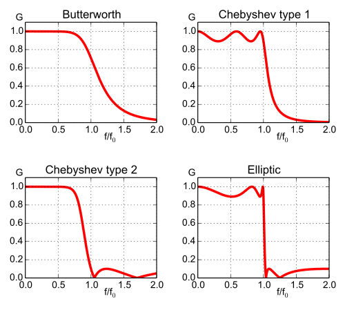 f/fo 1.0을 cut-off기준으로 삼아서 frequency를 자른다고 할 때, Buttterworth는 Chebyshev나 Elliptic보다 더 부드럽게 자르는 것을 알 수 있습니다. 천천히 자를 수록 자연스럽게 자를 수 있고, 빠르게 끊을 수록 정확히 해당 소리만 가져오게 됩니다.